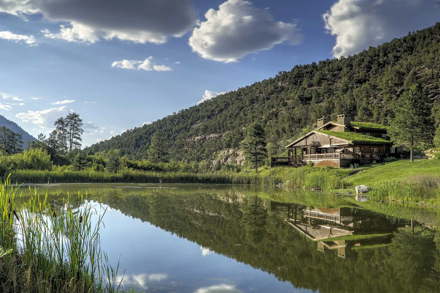 This three-bedroom vacation home is sited on a pinion and stone hillside above a small lake and overlooking a bend in the San Miguel River. A dry stacked stone wall containing three fireplaces, board and batten stained wood siding, and sprinklered “green” sod roof with deep overhangs bring the house in harmony with the surrounding environment.